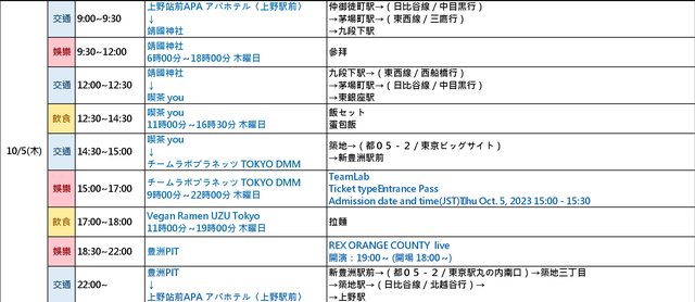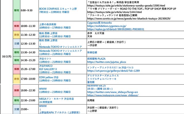 大家好,十月初會去東京自由行,行程基本上是獨自一人。以前去過兩次東京,但認真塞滿行程是第一次,主要會去展覽、快閃店、買宅物等,把想去的點排完後卡在交通選擇上,也擔心以一個人來說會不會還是排得太滿?以下行程希望各鄉民大大提供寶貴意見,感謝!