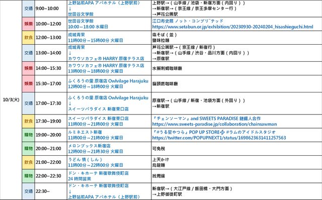 早上會去世田谷文學館看展,不確定會多久先抓兩個小時,中午吃附近的淡麗拉麵,下午去原宿的動物咖啡廳(時間夠的話兩間都想去看看)。晚上則是在新宿買宅物週邊。うどん慎這間烏龍麵好像要排很久,目前是想快打烊前過去試試手氣。