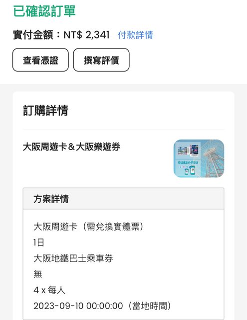 標題[讓售] 大阪周遊卡1日券*4 電子憑證2200元