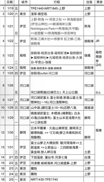 : 前後各兩天待在東京住在上野,沒有詳細的安排就不放了,其他天的行程安排如下表: