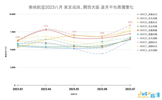 針對台灣虎航及樂桃航空在 東京成田、關西大阪 這兩條航點,出發月在八、九兩月於近