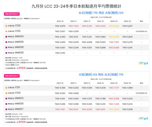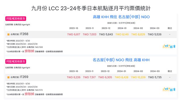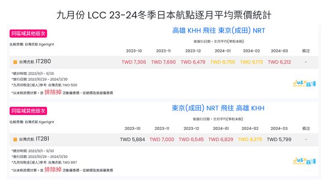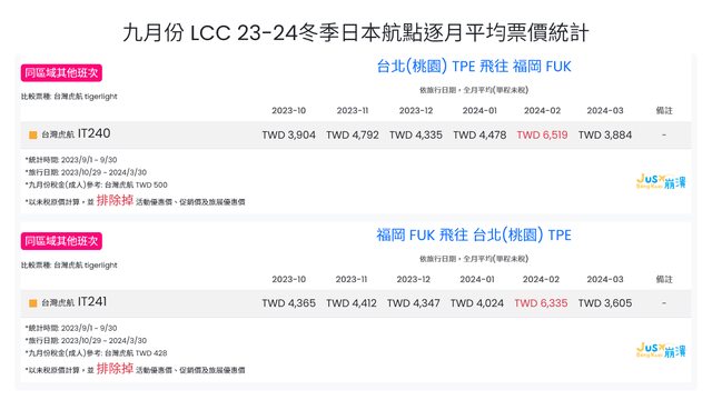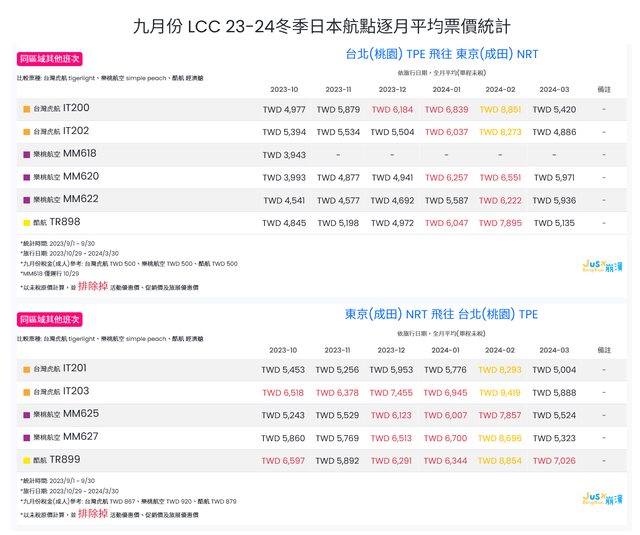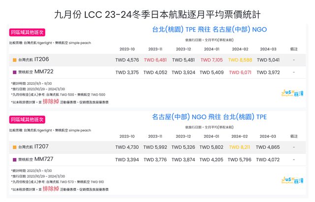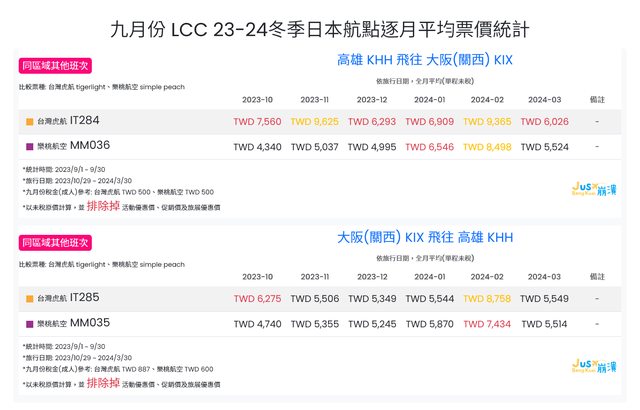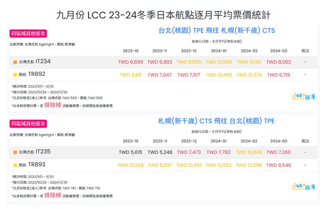 標題[分享] 9月份 LCC 23冬逐月平均票價統計
