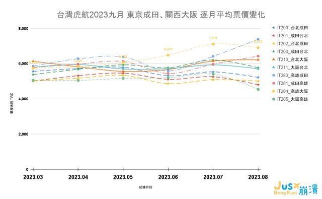 九月整體來看,各家均價上都是漲,且漲幅都不小,不過如果細看到航點或班次