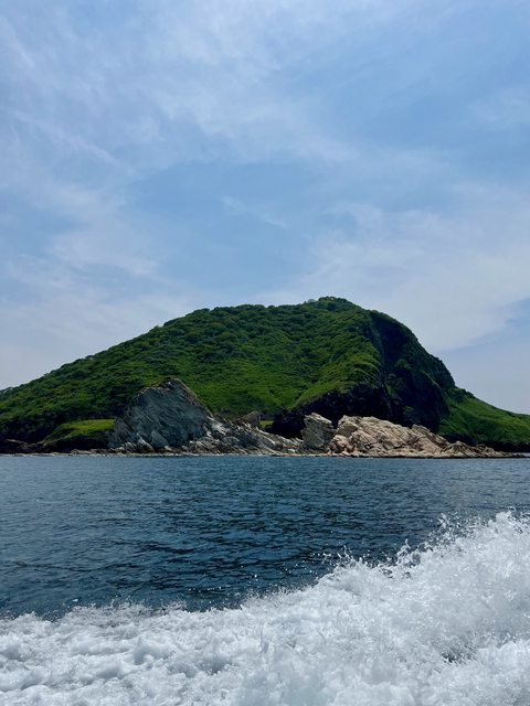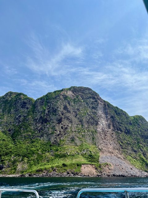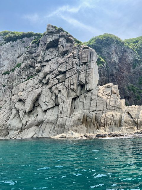 再往前可以見到龜島(雖然沒有拍到長得像烏龜的角度...)。龜島也屬於較淺色的岩石