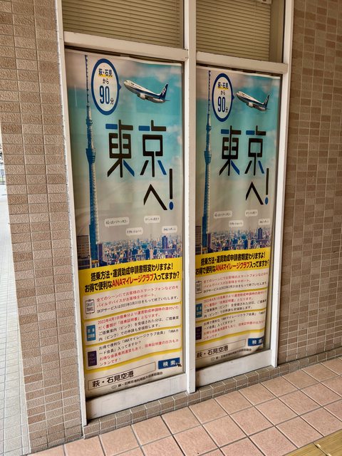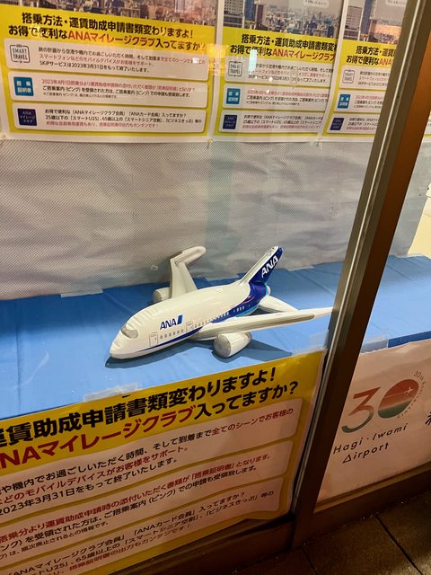 從益田駅前搭乘聯絡巴士,12分鐘就能到「萩・石見空港」,目前有一天兩班全日空的班