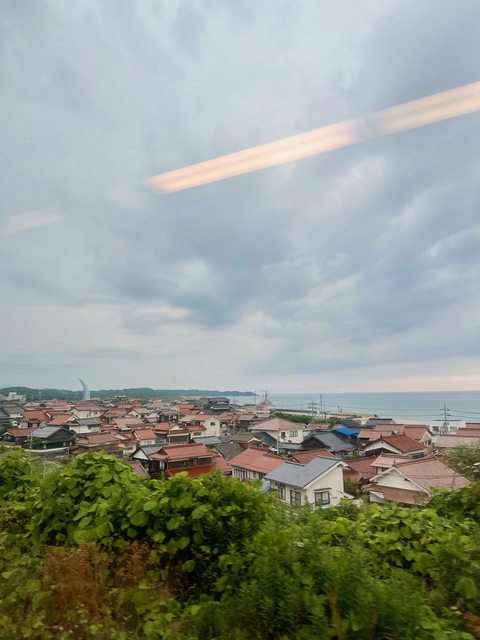乘著特急列車,離開出雲,就進到石見地方了。沿著海岸線的小聚落,家家戶戶的屋頂都