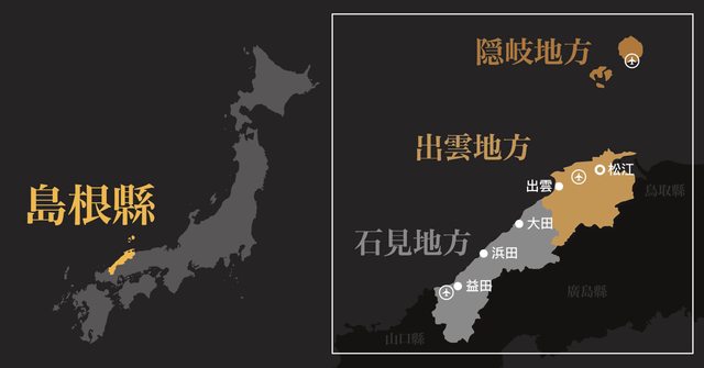 島根縣可以被分成人口密集、最著名的「出雲地方」、離島「隱岐地方」以及的「石見地