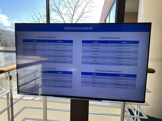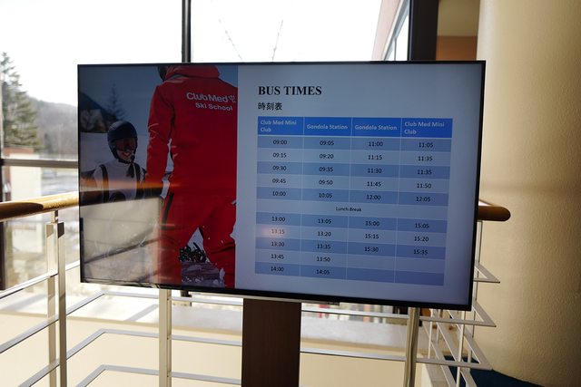 房間前往餐廳的路上有個螢幕,會公布每天課程狀態與接駁車班次。