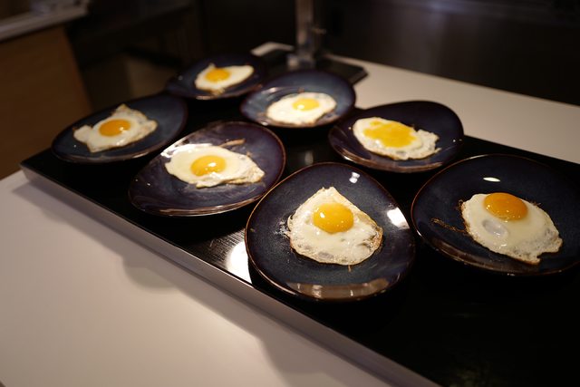 滿滿荷包蛋,厚瓷盤與下方的加熱板是非常熱的狀態。