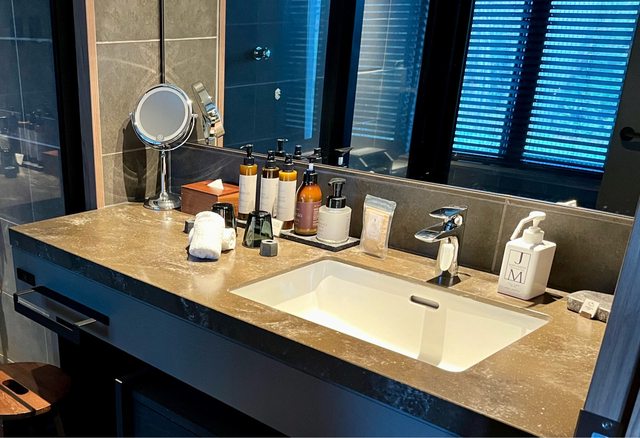浴室內使用的磁磚比官網照片中來得更有質感,似乎是有打磨過霧面的磁磚