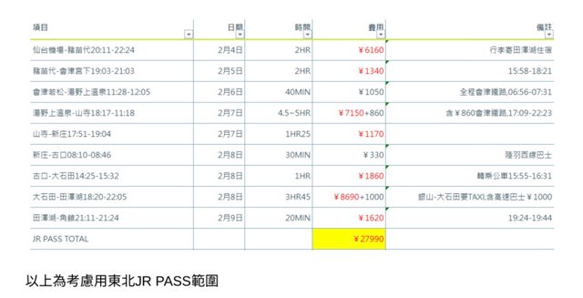 如下表格東北(2/4~2/9)目前行程範圍搭乘費用大約27990円,以整體方便性與機動性來說
