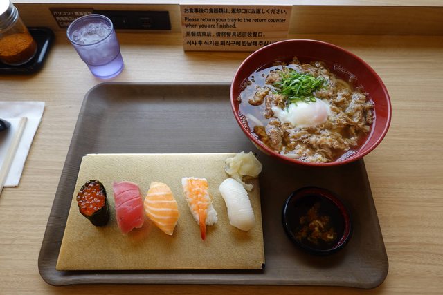 到成田機場用餐 才想起這趟完全沒吃生魚片或壽司的料理 在美食街簡單吃一下烏龍麵+握壽司的套餐(不過就普普) 也可以最後採買UNIQLO 比台灣便宜太多了