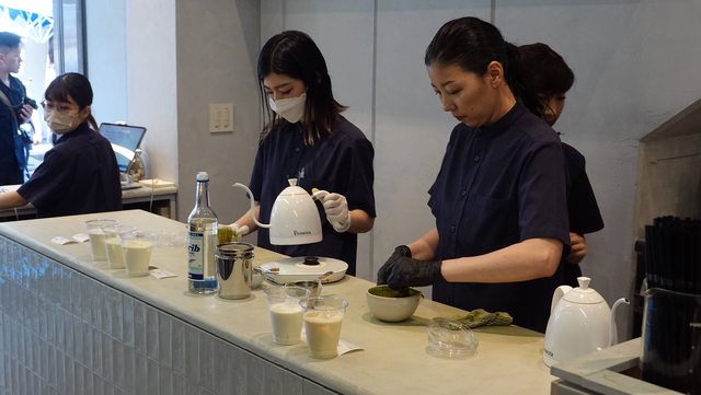 第四家喝 MATCHA STAND MARUNI 東京築地 因為剛吃完蝦餅超渴 該來個解膩的 這家特別的是他抹茶飲都現磨現煮的
