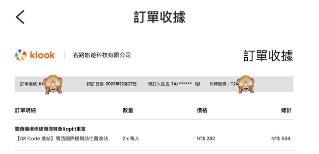 Klook購入價兩張NT564元