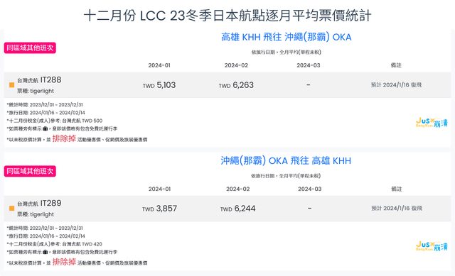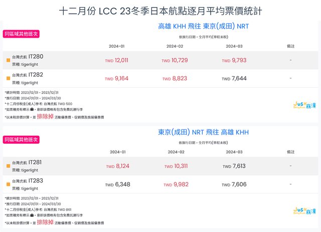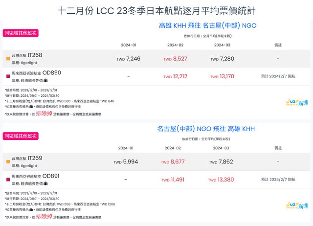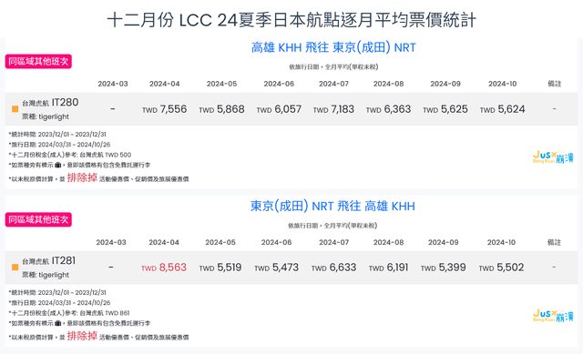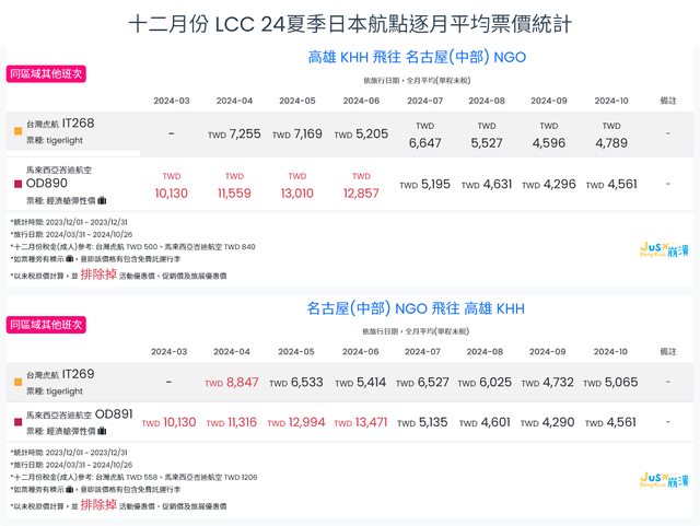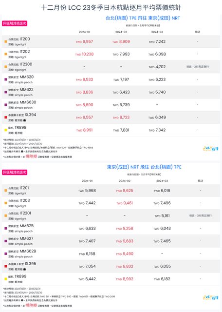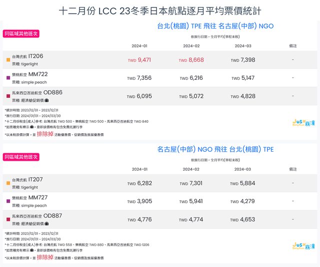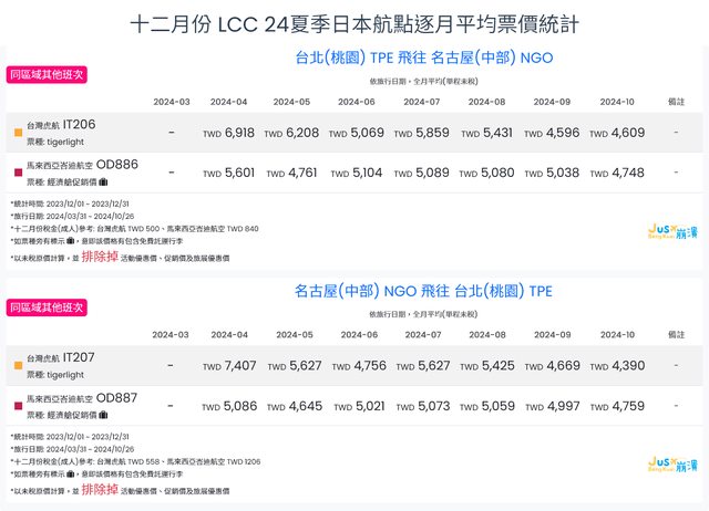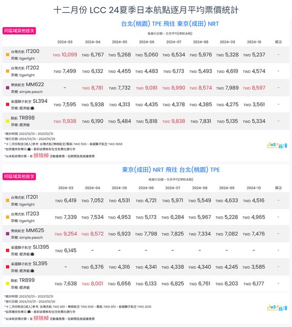 標題[分享] 12月LCC 23冬、24夏日本航點逐月均價統計