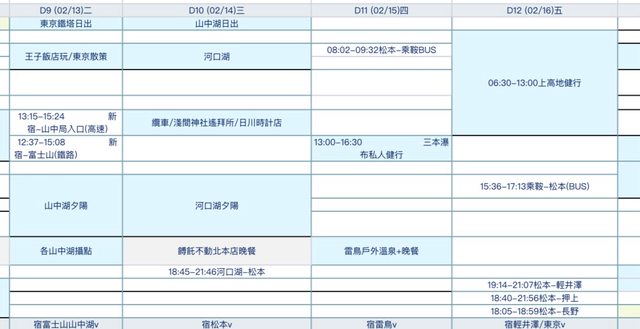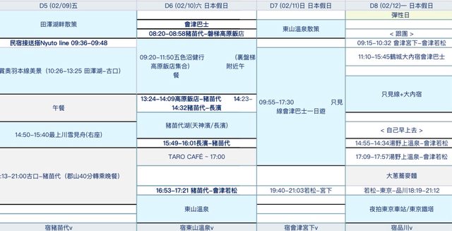 1. 螢光黃色欄位的那幾日是在考慮福島行程是否調換天數順序,主要是考量到交通順暢
