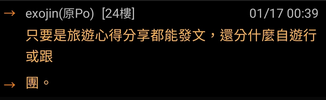 → exojin : 只要是旅遊心得分享都能發文,還分什麼自遊行或跟 01/17 00:39