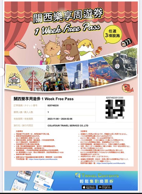 關西樂享周遊券 1 Week Free Pass 任選3項 1張