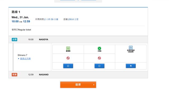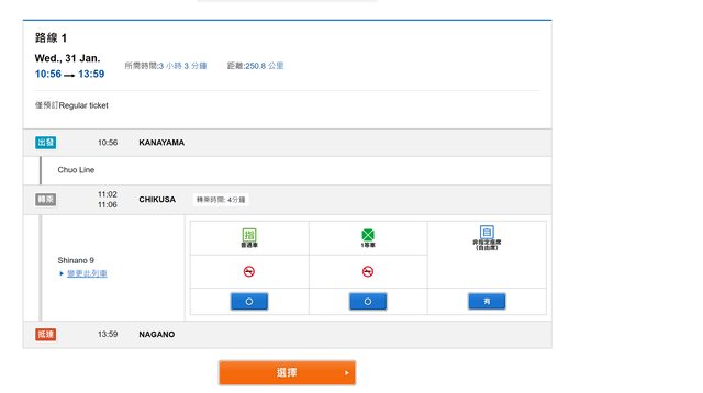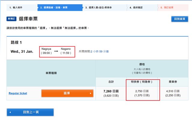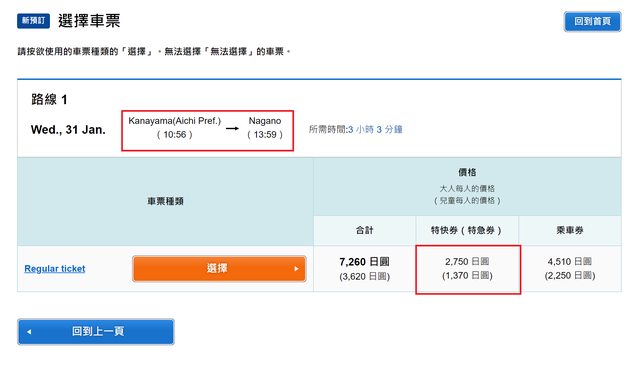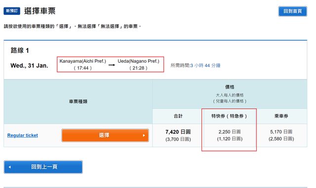 這裡是しなの選指定席特急料金總計(會因日期變動)