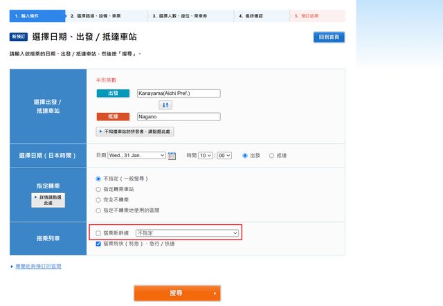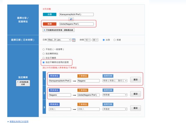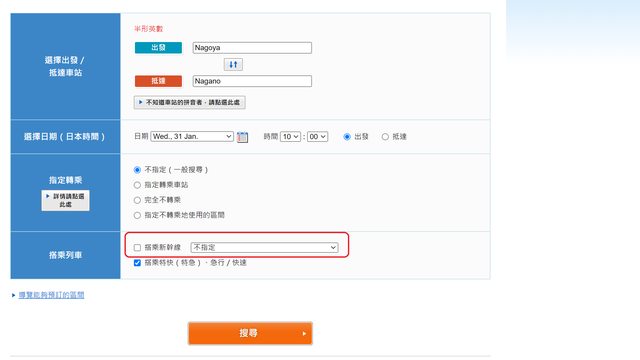 F.再按檢索(因為預設含新幹線,可能會出現轉東京到長野的新幹線,不要選錯)