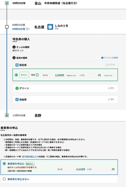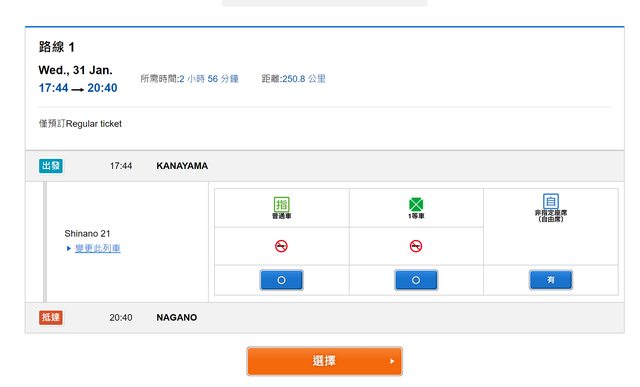 這裡是しなの選指定席+新幹線自由席的特急料金總計(會因日期變動)