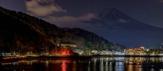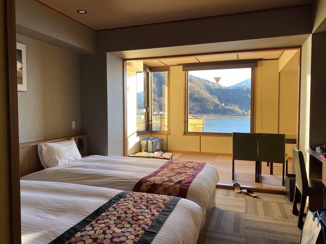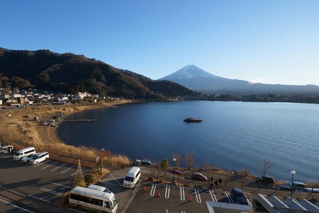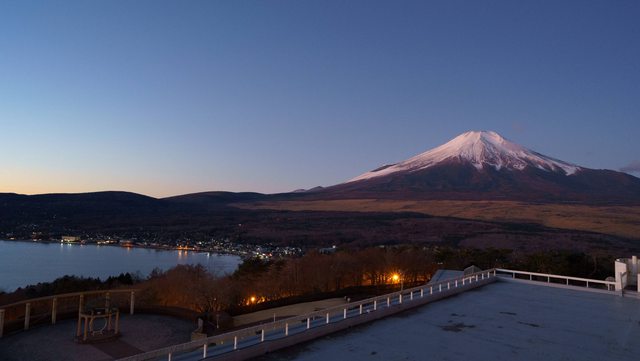 昨晚住山中湖的富士山大飯店,房間內可以直接看到山中湖及富士山,戶外風呂晚上可以看星星,早上可以看富士山。飯店位在半山腰,路面如果結冰開車需要小心。外有個森林小徑可以散步。