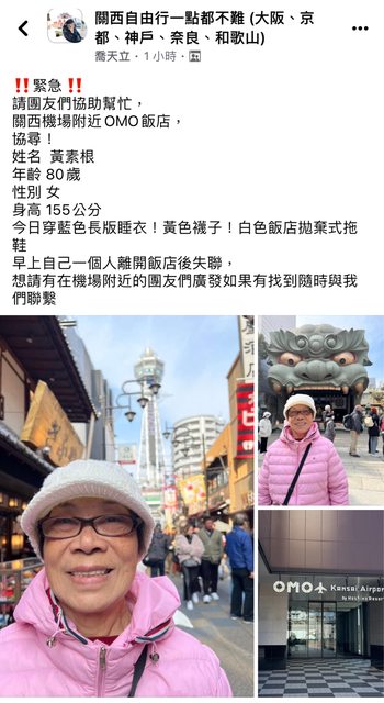 早上在臉書關西旅遊社團看到有人家中長輩走失,幫忙截圖過來,希望在關西機場附近的