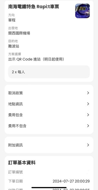 1. 讓售品項:南海電鐵特急 Rapi:t車票 關西機場-難波
