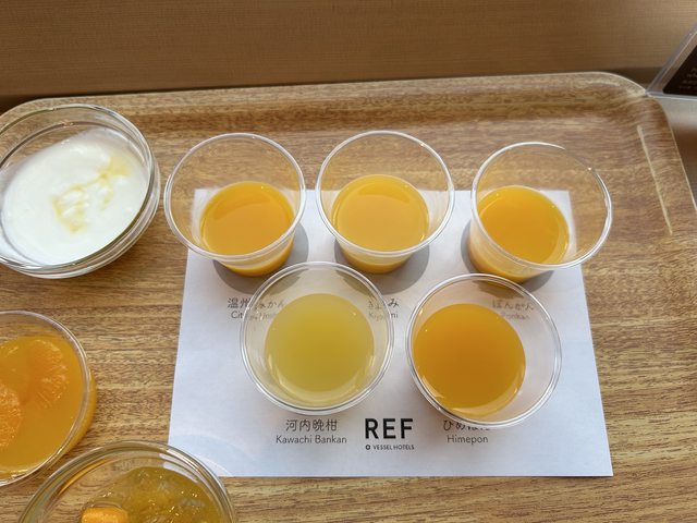 特色,飲料區有五種不同愛媛盛產的柳橙汁可做選擇,蜜柑口味的沙拉醬、味麵包果醬