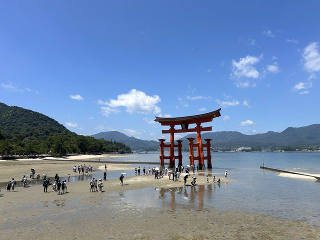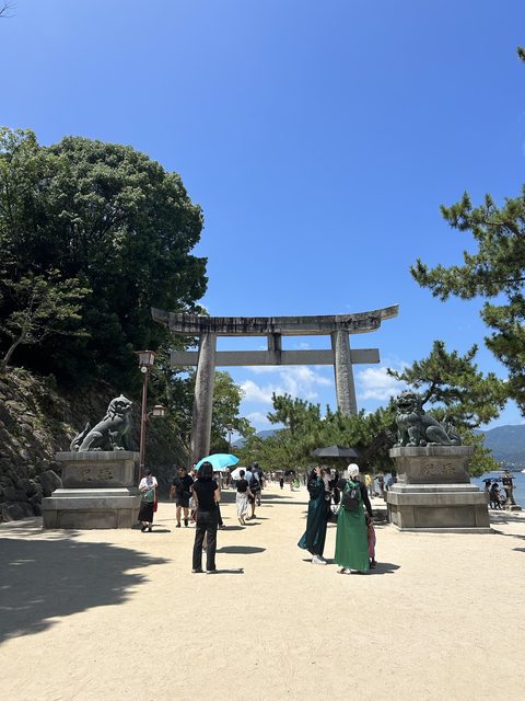 走道商店街的盡頭就是嚴島神社了,先跟著人流到沙灘,拍攝退潮狀態的海中鳥居,這裡