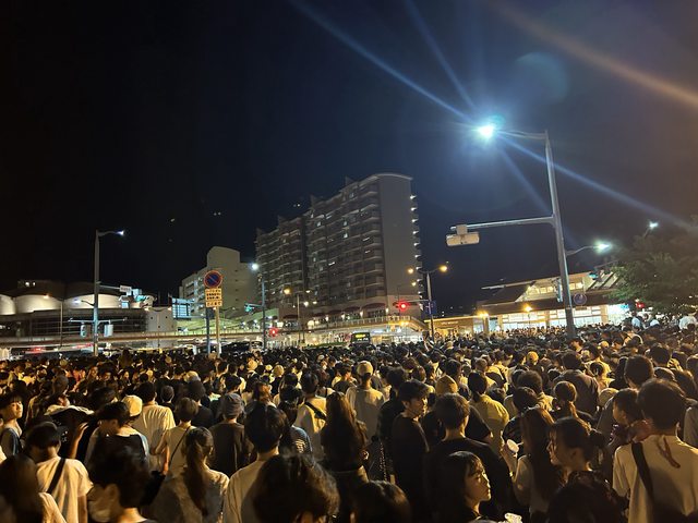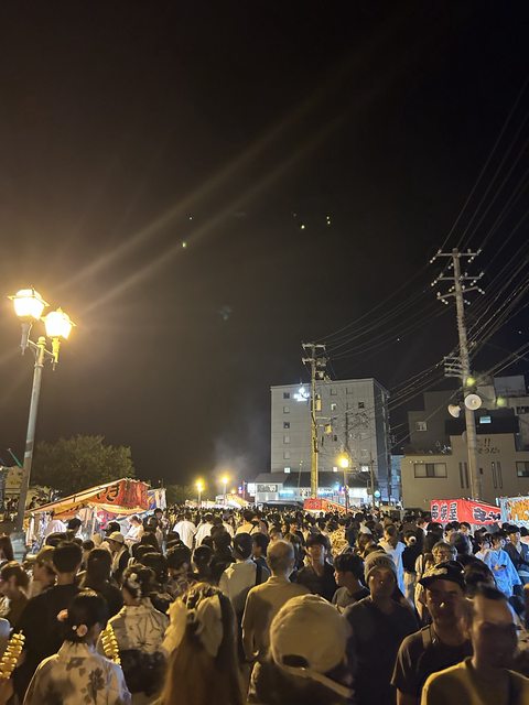 漫步在祭典的氣氛中,買了檸檬沙瓦和一些攤販的小吃,勉強在一堆野餐墊之中找了一個