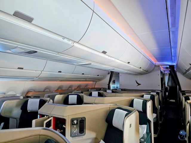 A350-900商務艙配置為1-2-1反魚骨式排列,特選經濟艙為2-4-2,經濟艙為3-3-3。