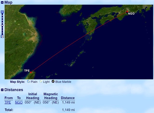 台北到名古屋距離為1149 miles,預計飛行時間為2小時50分鐘。