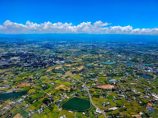 近處左側大樓區域是桃園青埔,中間可以看到樂天桃園棒球場,遠處就是中壢市區。