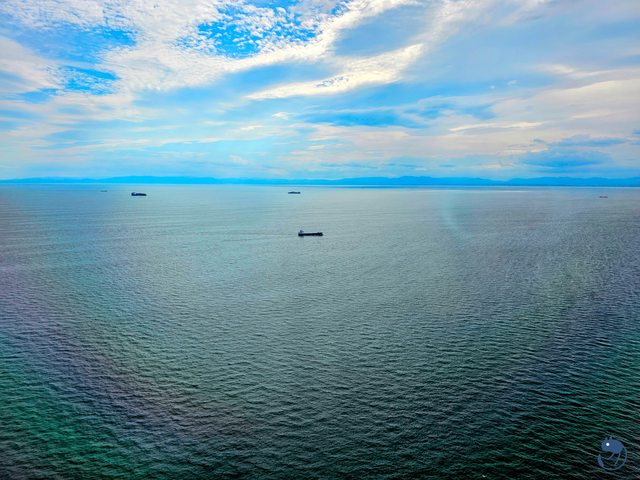 從觀音海邊出海,照片中間由下而上分別是觀音海水浴場、觀塘液化天然氣接收站(2021