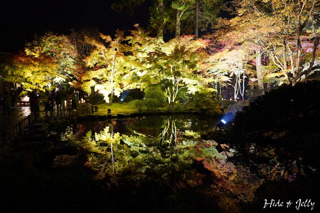 円通院內另一個亮點,就是心字池了,平靜的水面,完整的倒映出打著燈光的楓葉,顛倒