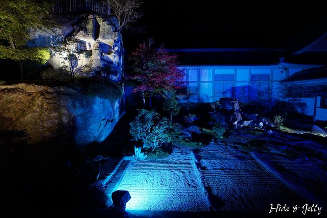 本堂側邊的石佛庭園也打上藍色的燈光,呈現迷幻的氛圍。