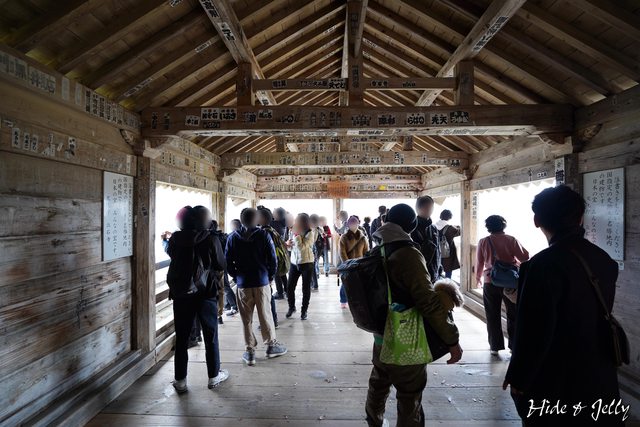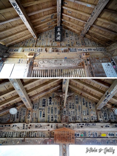 堂內的屋頂與梁柱,貼滿了來參拜的公司行號,江戶、能登、水戶、淺草,各地都有。