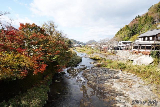 山寺宝珠橋橫渡的立谷川,在乾水期的秋季水位不算高,兩岸有一些小楓葉,右側的巨石
