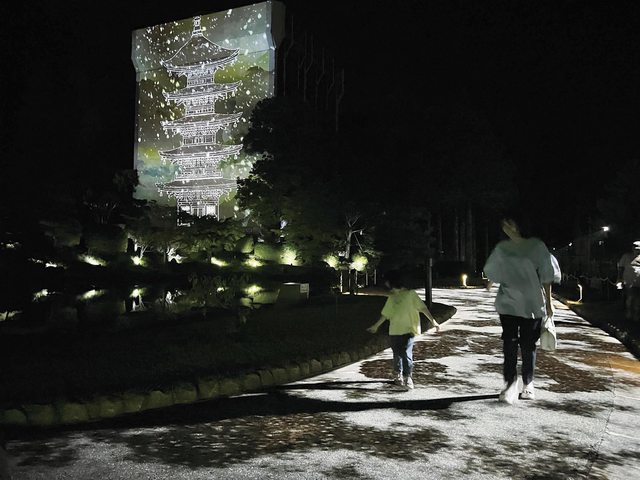 將修繕中的國寶「瑠璃光寺五重塔」外圍的工程布作為投影布幕的影像光雕秀。此次邀請國際上活躍的舞台藝術導演「森弘一郎」擔任主視覺設計導演,呈現古時大內氏一族於山口地區度過的四季更迭之美景。不同於第1彈的展示內容,於五重塔池塘邊步道引進地面互動式投影系統。配合四季主題的影像內容,感應行人步伐呈現對應的互動特效。