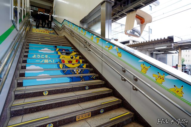 從新幹線往在來線的月台,階梯上還有皮卡丘站長呢。