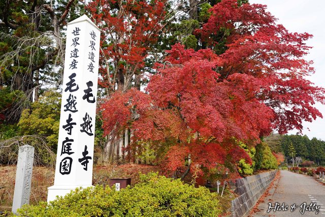 世界遺產毛越寺庭園的碑旁,就有火紅的楓葉在歡迎我們了,一旁的「醫王山毛越寺」石