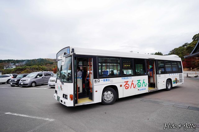 腳力,我們選擇搭乘平泉町的巡迴巴士「るんるんバス」(RUNRUN巴士),乘車處就在毛越