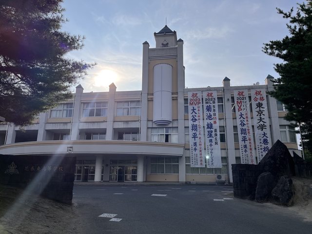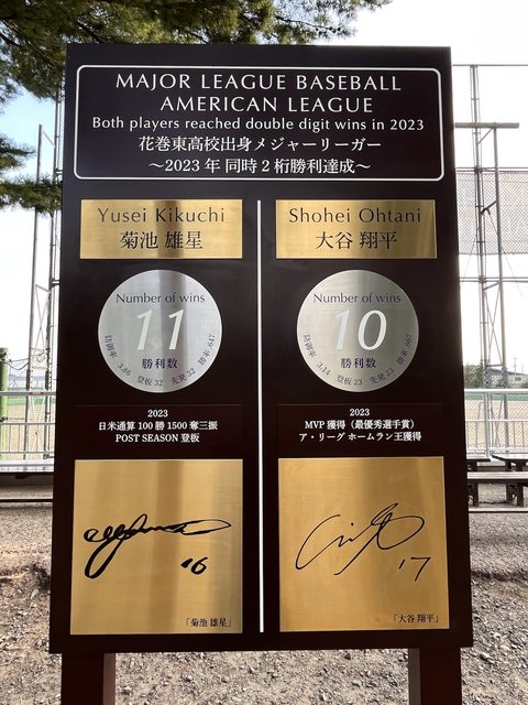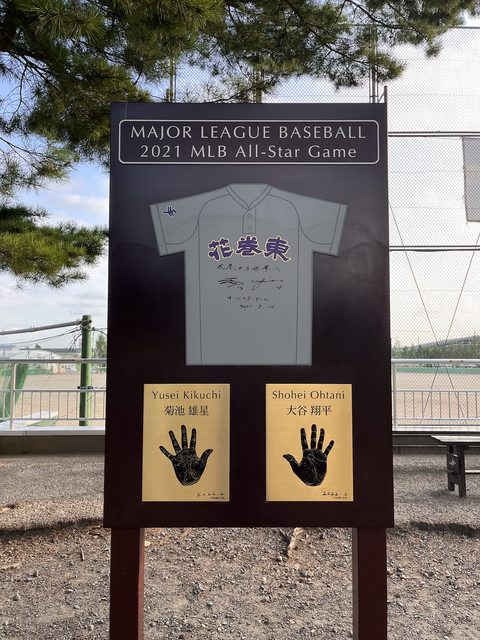 設有該校畢業的兩個MLB選手菊池雄星和大谷翔平的手印及簽名