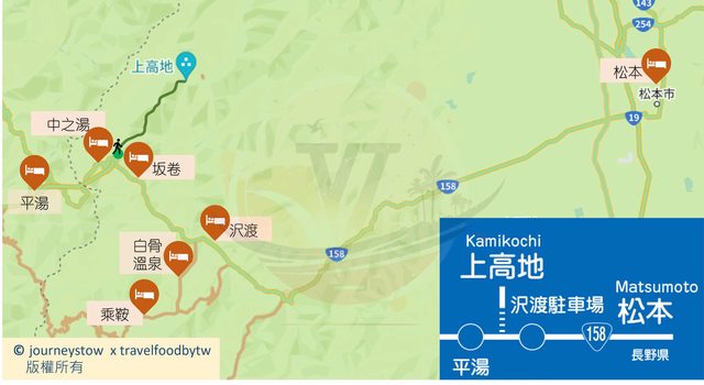 上高地的飯店隨著封山暫停營業,周邊有一些住宿選項,沿著國道158號會依序經過