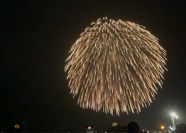 驚呼聲及掌聲中,先有一些煙火以五彩繽紛的花朵綻放,到最高點時炸開、金黃色的光芒