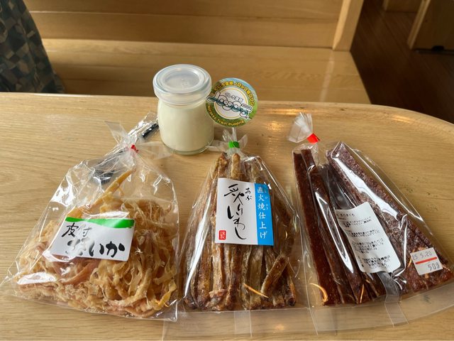 邊欣賞風景,邊享用在和商市場買的魚乾及車上販售的布丁。