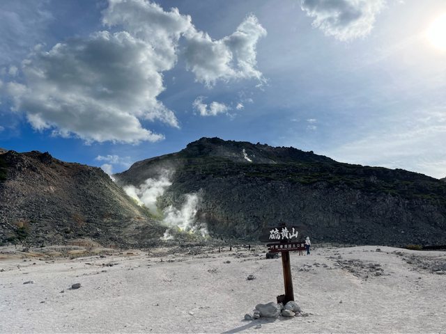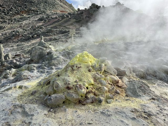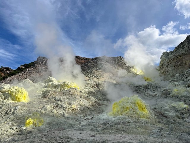 這裡可以近距離觀察山腰上的噴氣孔冒著白煙,空氣中瀰漫著硫磺的味道,感受活火山的