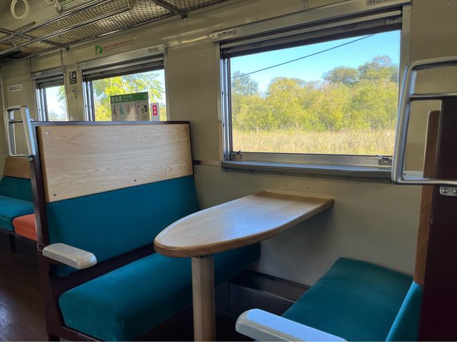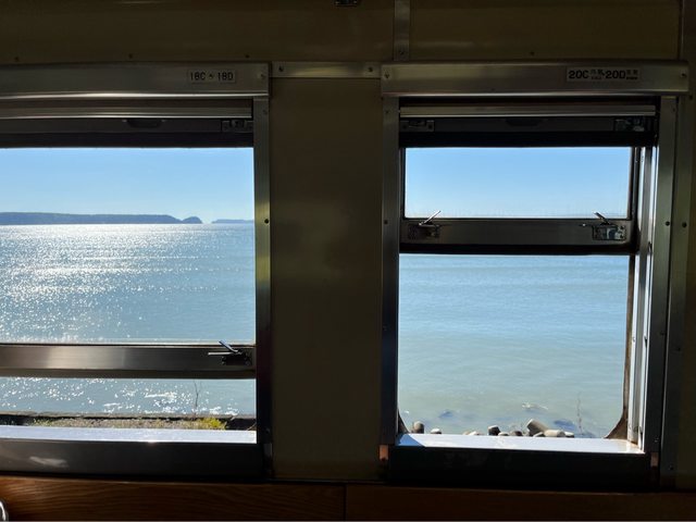 搭乘的是地球探索鐵道號,兩節車廂的外觀不同,一節是指定席、一節是自由席。