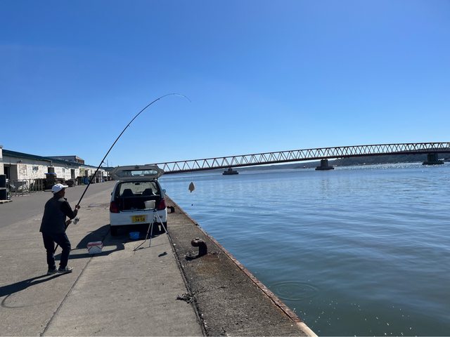 走到海邊、看到厚岸大橋,是北海道首座海上橋樑。有些人在岸邊釣魚。